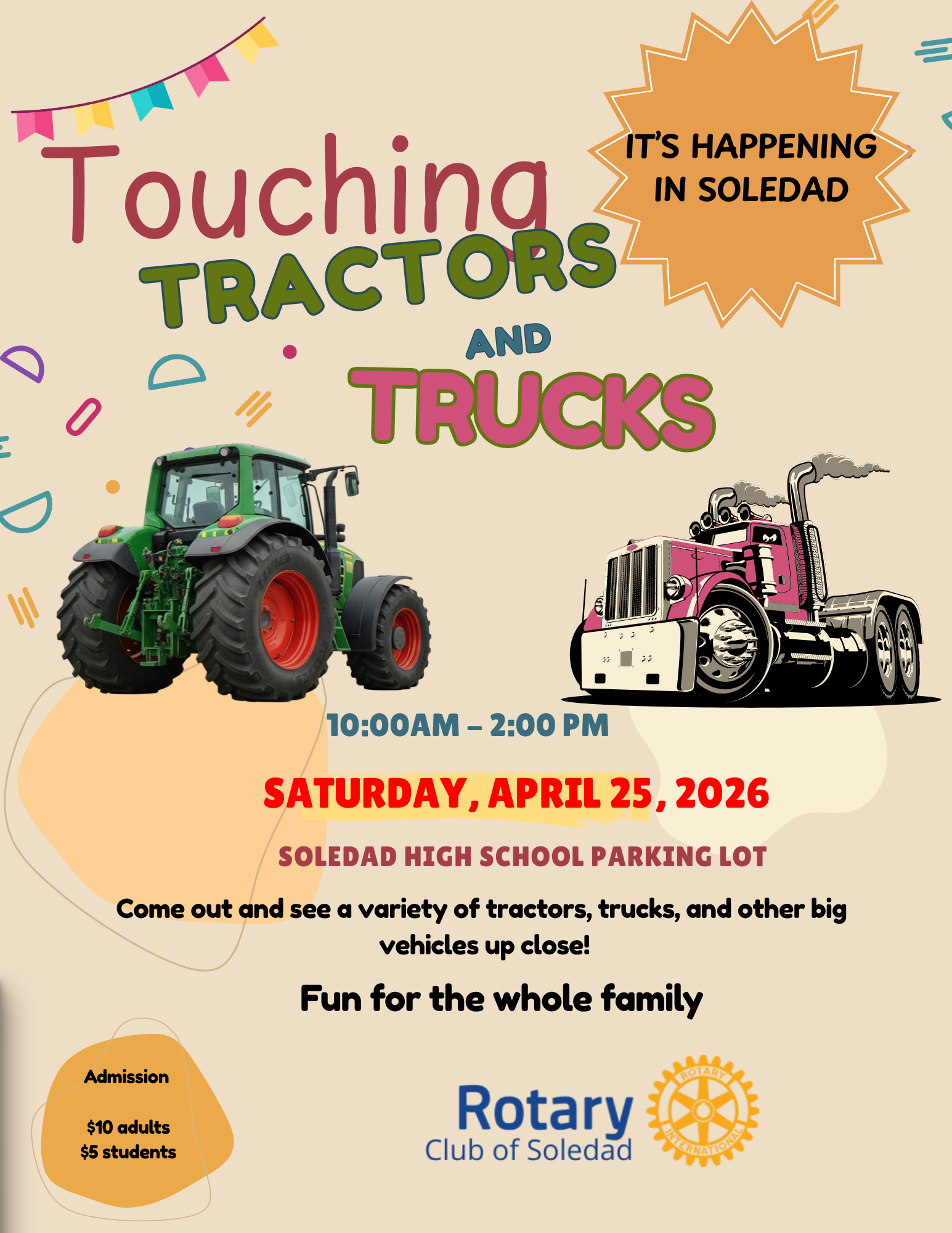 Join us for a fun, hands-on community event where kids (and adults!) can get up close with tractors, trucks, and other big vehicles!📅 Saturday, April 25, 2026🕙 10:00 AM – 2:00 PM📍 Soledad High Scho...