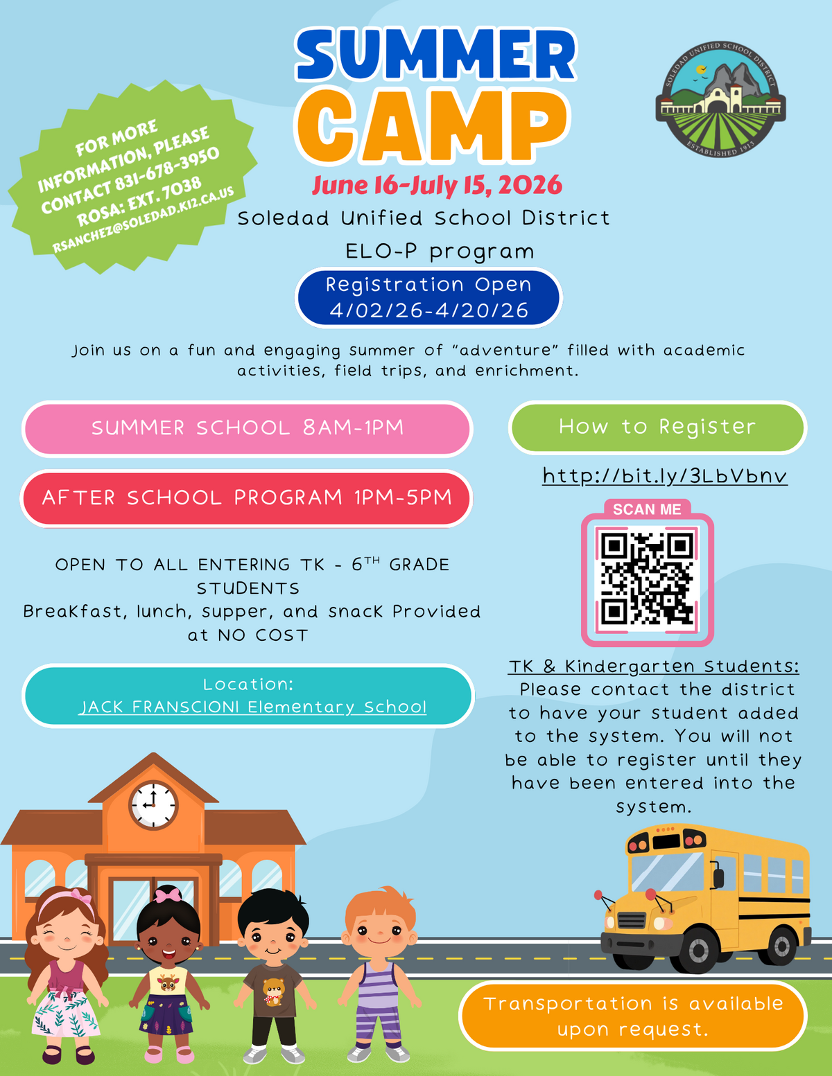 βοΈ Summer Camp 2026 β Now Enrolling! πSoledad Unified School Districtβs ELO-P Program is excited to offer a fun and engaging Summer Camp from June 16 β July 15, 2026.Students will enjoy a summer fu...