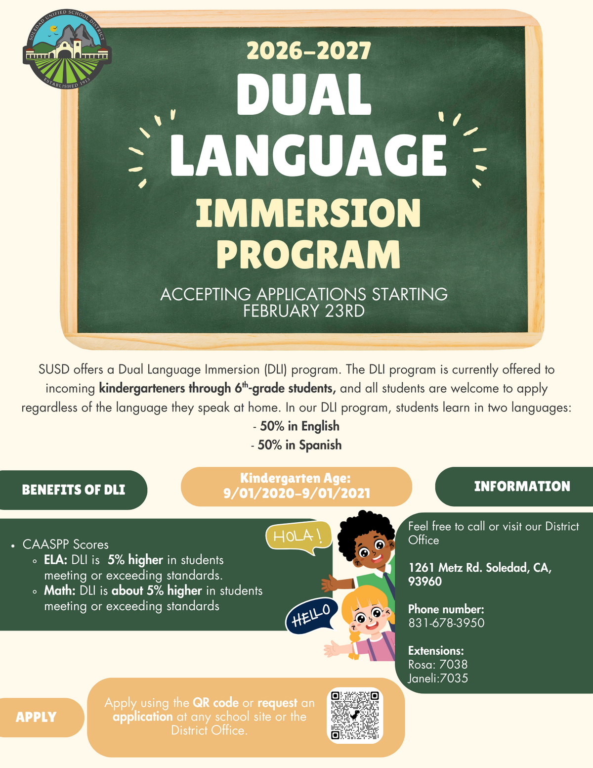 Soledad Unified School District is accepting applications for the Dual Language Immersion (DLI) Program starting February 23.Who can apply kindergarteners through 6th-grade students Students can ap...